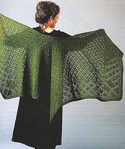 The Spanish Christening Shawl, shown on the left, was inspired by a1950's photo of a baby wrapped in lace and held lovingly by it's grandmother. The center section is a simple diamond lace pattern and the wide garter stitch lace edging makes an elegant scalloped border.